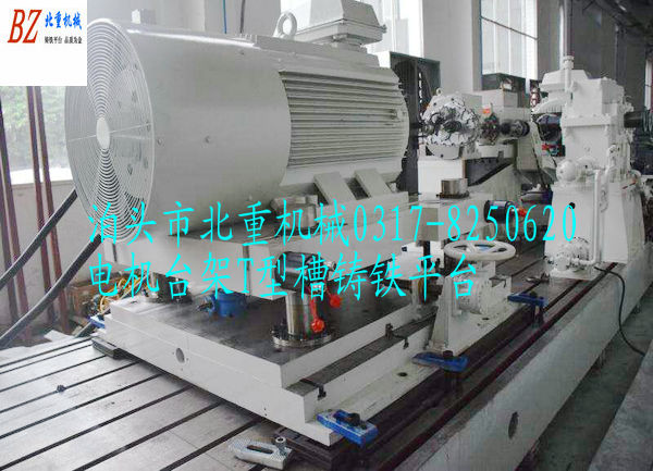 電機(jī)臺(tái)架T型槽鑄鐵平臺(tái),T型槽鑄鐵平板工作面都加工有T型槽,中間距為200mm,一般用28t型螺絲,精度為2級(jí)。這樣的設(shè)計(jì)就是為了把電機(jī)定位在鑄鐵平臺(tái)上面,轉(zhuǎn)起來試驗(yàn),要得到數(shù)據(jù)等!